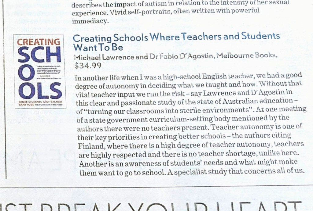 Lawrence’s book is a lot more than just an indictment of Australia’s current education system (including issues relating to standardisation, teacher status, funding – which is given due prominence – and student wellbeing). It is a well-researched “call to arms” for the current system to change and a brief history of how Finland’s education system produced “the world’s most literate citizens”.