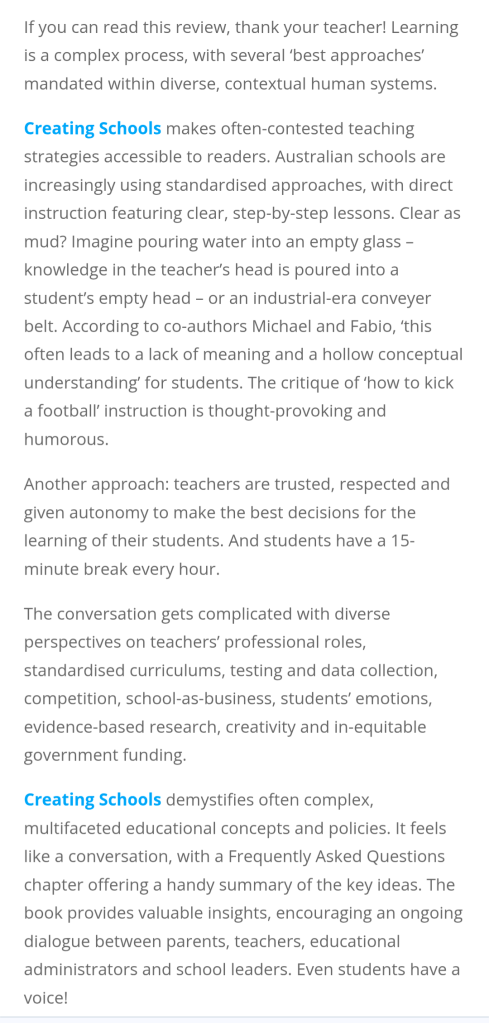 The book is a salutary reminder of the cost of an education system, such as we have in Australia, which is based on standardised testing – that one size fits all approach which, as he points out, makes testers a fortune, produces pretty flowcharts, and provides parents with ‘data’ to assist in their school choice for offspring, but ultimately has very little to do with student learning.
